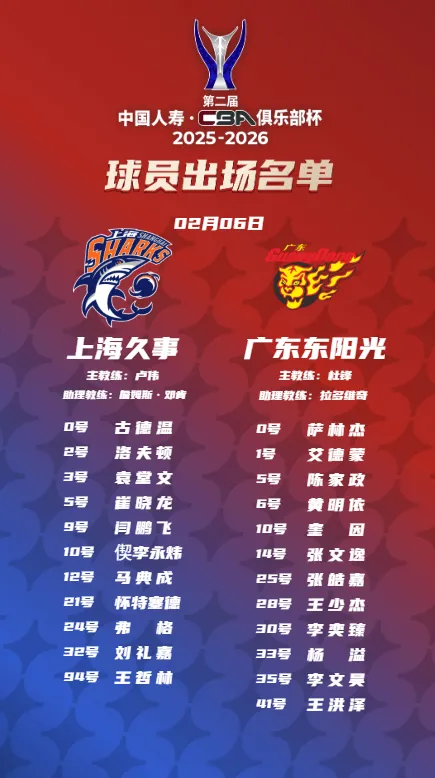 虎扑02月06日讯 今日CBA俱乐部杯赛,上海对阵广东的大名单已经公布。